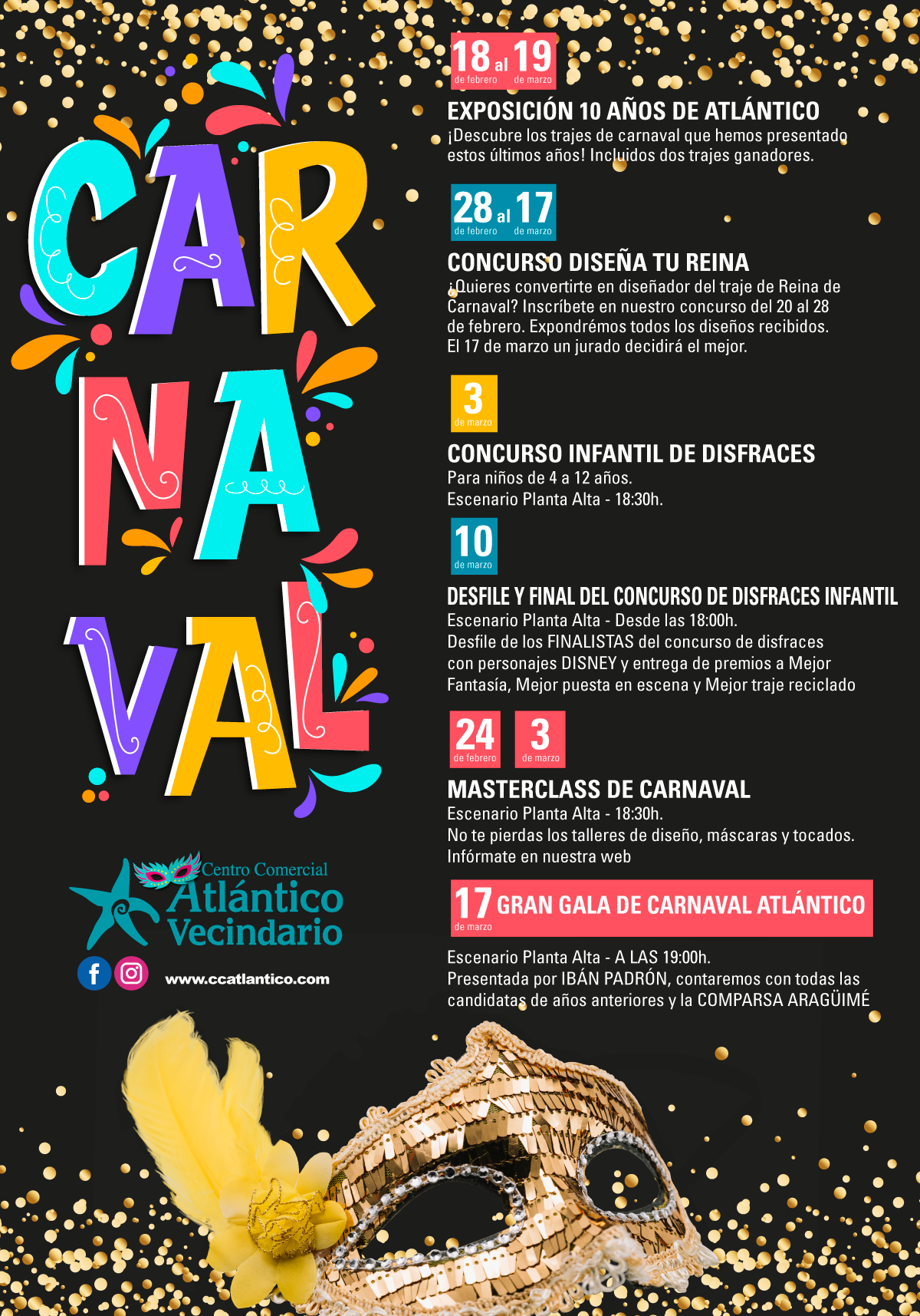 En escenario Planta Alta. Gala para cerrar la campaña de Carnaval donde se recordara las actuaciones de años anteriores de las candidatas del centro comercial, a través de una pantalla gigante puesta en el escenario, habrá actuación de la archiconocida Comparsa Aragüimé y estarán presentes en el acto todas las candidatas de los años anteriores del centro comercial. La Gala será presentada por el conocido presentador de Antena 3, Ibán Padrón. Entrega de premios de los diferentes concursos hechos, en las semanas previas de Carnaval.